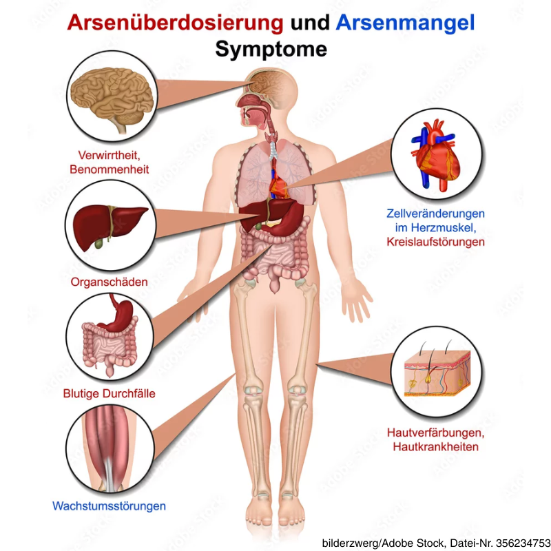 - Zellschädigung und DNA-Schäden: Arsen fördert oxidative Prozesse und schädigt die Erbsubstanz.