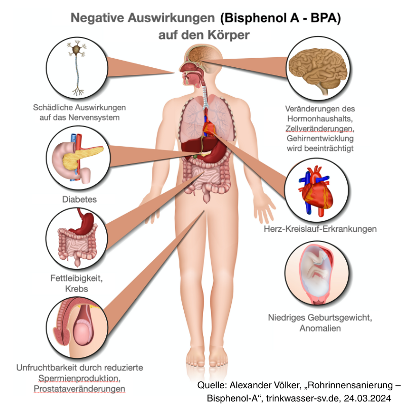 Bisphenol A (BPA) gehört heute zu den am besten untersuchten endokrinen Disruptoren. Wird im Leitungswasser Bisphenol A nachgewiesen, kann der Stoff im menschlichen Körper hormonähnlich wirken und insbesondere den Östrogen-Stoffwechsel beeinflussen.
