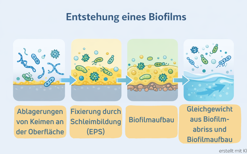 Die Entstehung der Schicht beginnt oft harmlos: Einzelne Keime setzen sich an einer Oberfläche ab und vermehren sich dort. Wenn die Bedingungen stimmen – etwa bei lauwarmem, stehendem Wasser und organischen Rückständen – wächst innerhalb weniger Tage ein stabiler Biofilm heran.