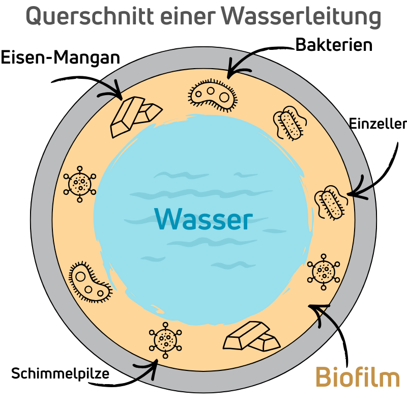 Schleimartige Schichten, sogenannte Biofilme, bilden sich aus Mikroorganismen wie Bakterien, Pilzen und deren Stoffwechselprodukten. Diese Organismen lagern sich an Oberflächen in feuchten Umgebungen ab – beispielsweise in Wasserleitungen oder auf Armaturen. Die Mikroben umgeben sich mit einer selbst produzierten Matrix aus Proteinen, Polysacchariden und anderen Substanzen. So können sich in Biofilme Bakterien einen Schutzraum schaffen, der sie vor Hitze, Desinfektionsmitteln und sogar Antibiotika weitgehend abschirmt.1